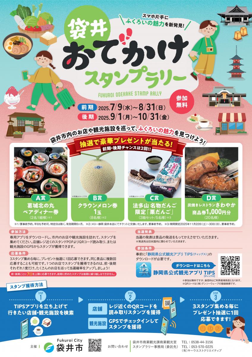 袋井市内のお店や観光施設を巡って、楽しんでいただくスタンプラリーを開催中です。 スマホ片手にふくろいの魅力を新発見しませんか? スタンプを3つ取得すると抽選にご応募できます。 買い物や食事、観光を楽しみながらスタンプを集めて豪華景品が当たる抽選に応募しましょう! 【実施期間】前期 2025年7月9日(水)~8月31日(日) 後期 2025年9月1日(月)~10月31日(金) 【開催場所】袋井市内店舗 ※約120店舗・5観光施設